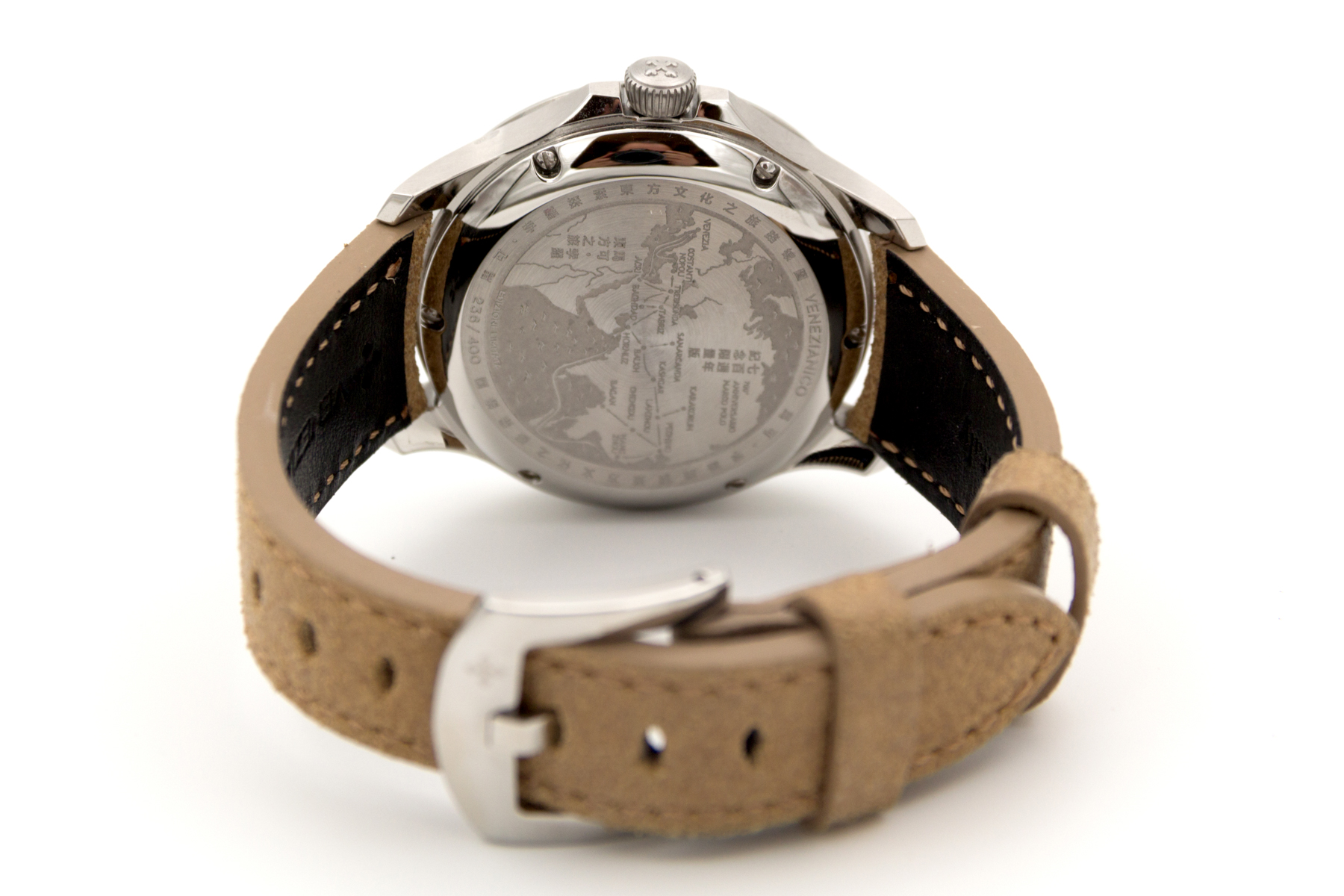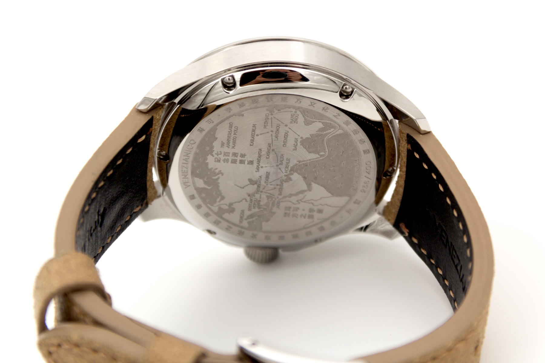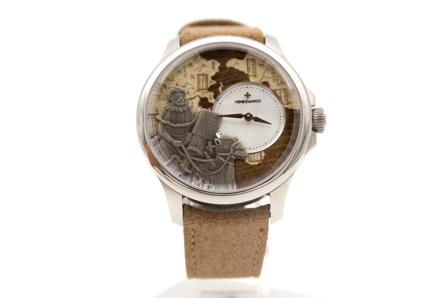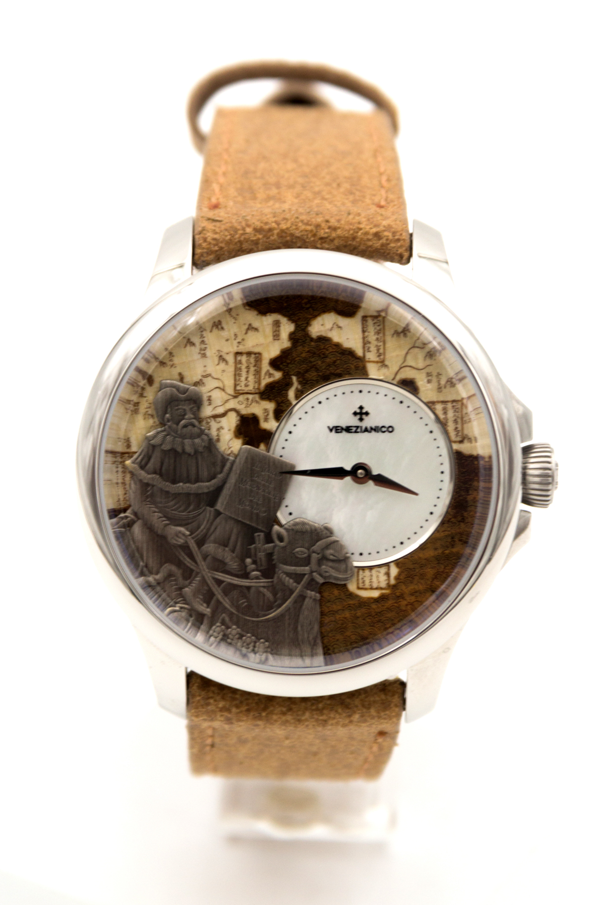 İtalya dan bağımzsız bir saat markası… Venezianico… Biz de bu şirketin eski ismi Meccaniche Veneziane ismi ile de Redontore bir saati var… Yeni ismi Venezianico adını aldıktan sonra şirket daha da globale oynamaya karar verdi… Çok hoş yeni ürün aileleri sırayla gelmeye başladı.. Buradaki saatimiz ünlü seyyah Marco Polo’nun ölümünün 700. yılı şerefine üretilmiş içi işlemeli bir saat… Saat tümüyle el işçiliği ile ve sadece 400 adet üretilmiş. Kadranında, “Il Milione” kitabını tutarak bir dromedarin üzerinde tasvir edilen Marco Polo’nun pirinç kabartması bulunmakta.. Papirüs zemin üzerine işlenmiş Asya haritası, onun Doğu’ya yaptığı destansı yolculukları anlatmaktadır.. Saat 3 konumunda yer alan sedef kadran, bu kompozisyona zarif bir dokunuş ekleyerek ünlü kâşife adeta bir saygı duruşunda bulunmuş.