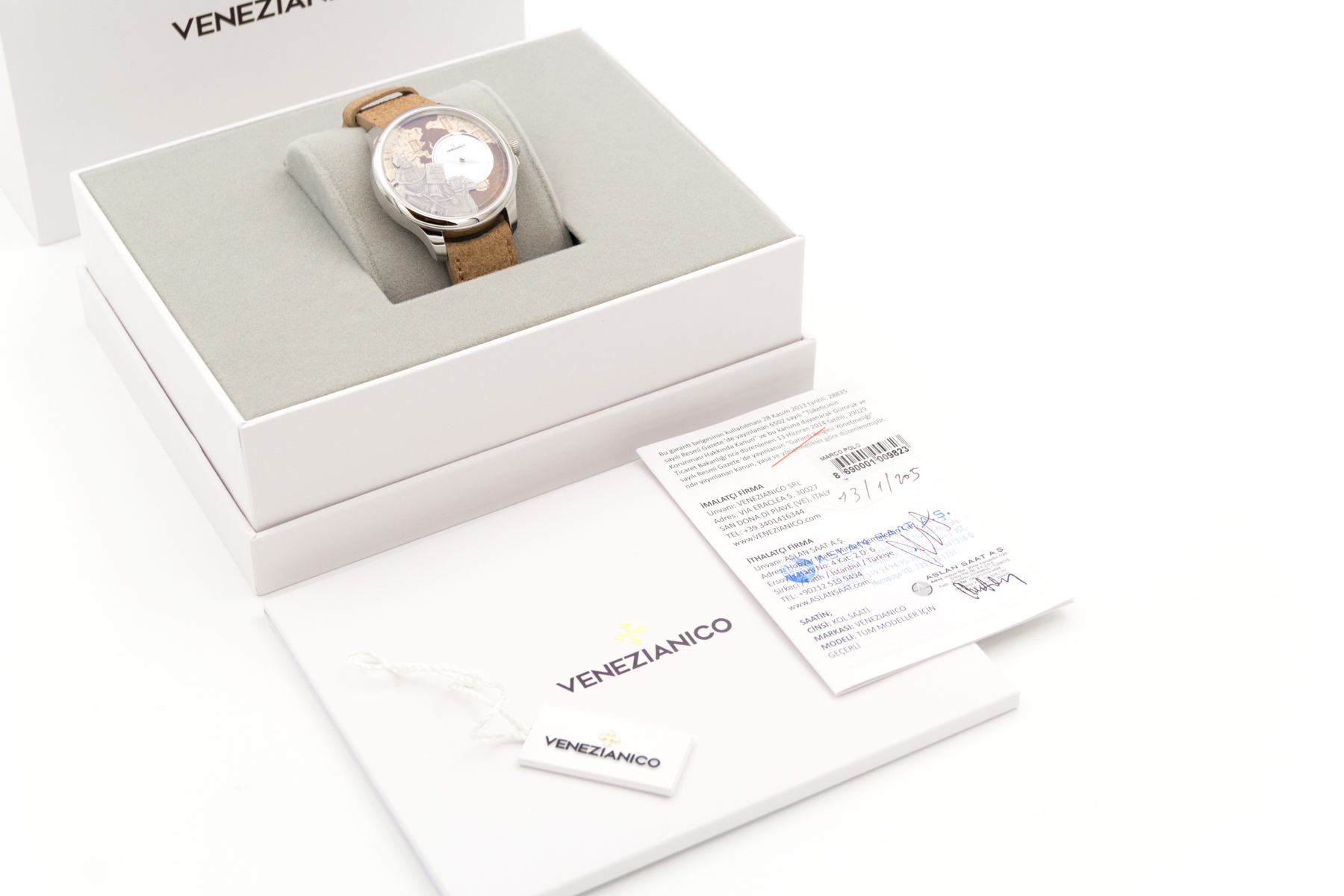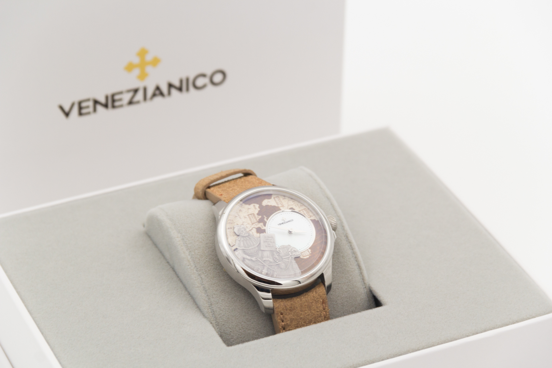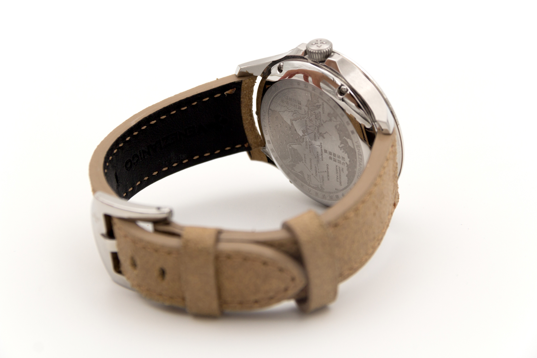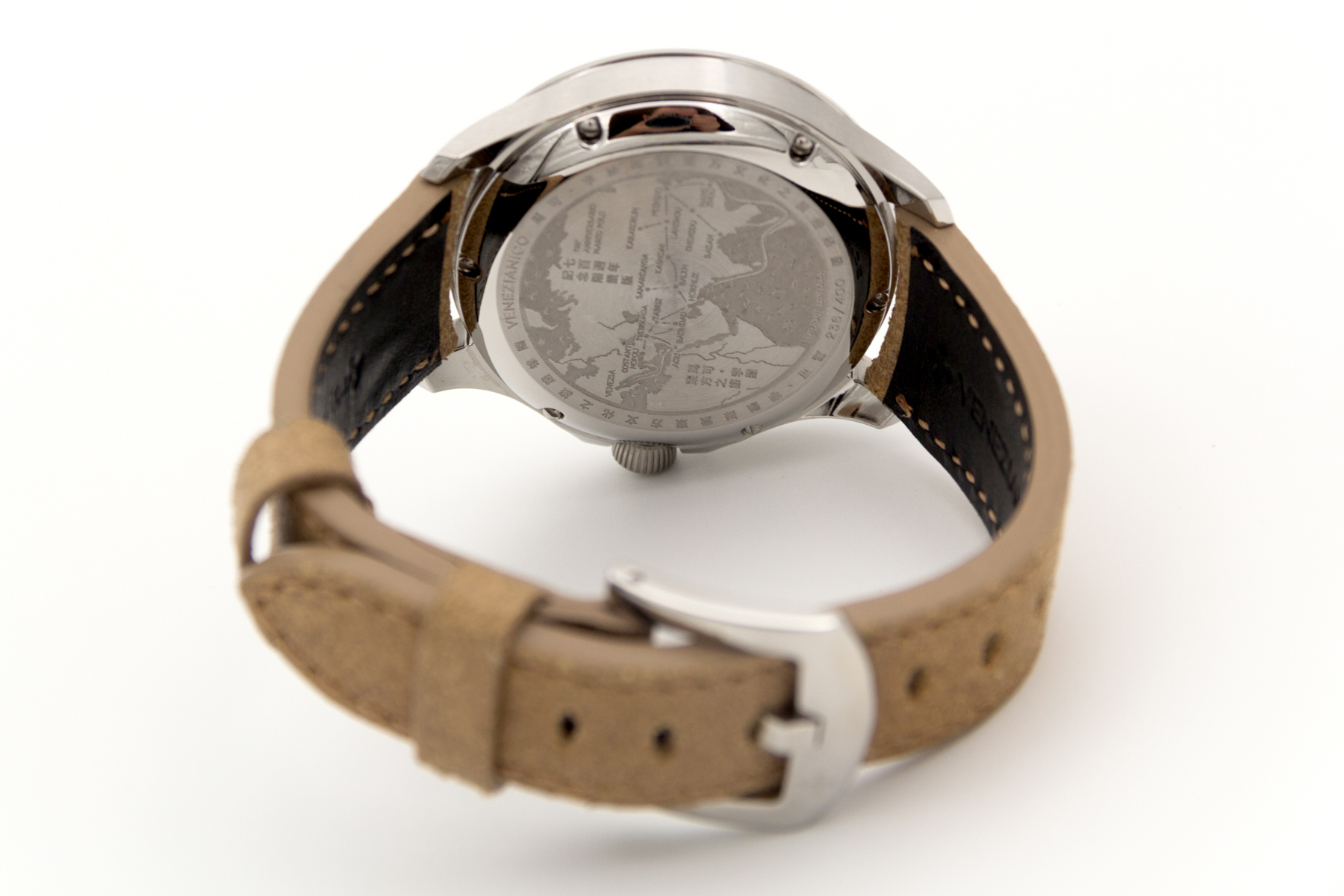 İtalya dan bağımzsız bir saat markası… Venezianico… Biz de bu şirketin eski ismi Meccaniche Veneziane ismi ile de Redontore bir saati var… Yeni ismi Venezianico adını aldıktan sonra şirket daha da globale oynamaya karar verdi… Çok hoş yeni ürün aileleri sırayla gelmeye başladı.. Buradaki saatimiz ünlü seyyah Marco Polo’nun ölümünün 700. yılı şerefine üretilmiş içi işlemeli bir saat… Saat tümüyle el işçiliği ile ve sadece 400 adet üretilmiş. Kadranında, “Il Milione” kitabını tutarak bir dromedarin üzerinde tasvir edilen Marco Polo’nun pirinç kabartması bulunmakta.. Papirüs zemin üzerine işlenmiş Asya haritası, onun Doğu’ya yaptığı destansı yolculukları anlatmaktadır.. Saat 3 konumunda yer alan sedef kadran, bu kompozisyona zarif bir dokunuş ekleyerek ünlü kâşife adeta bir saygı duruşunda bulunmuş.